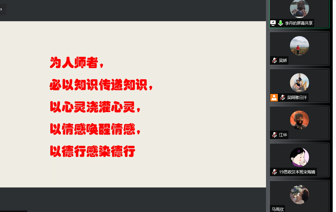 为学习贯彻落实习近平总书记在中国人民大学重要讲话精神,推进大中小学思政课一体化建设,进一步落实实践教学工作要求,提升思想政治教育专业师范生教学技能,成人免费黄色视频举行大中小学校《习近平新时代中国特色社会主义思想学生读本 》示范课课例展示及研讨活动系列的第二讲。5月20日下午,我院邀请海拉区实验高级中学思政课教师李丹为2019级、2020级全体同学做题为《育人为本 提升素养》的线上讲座。本次会议由成人免费黄色视频实习实训中心主任吴娇主持。