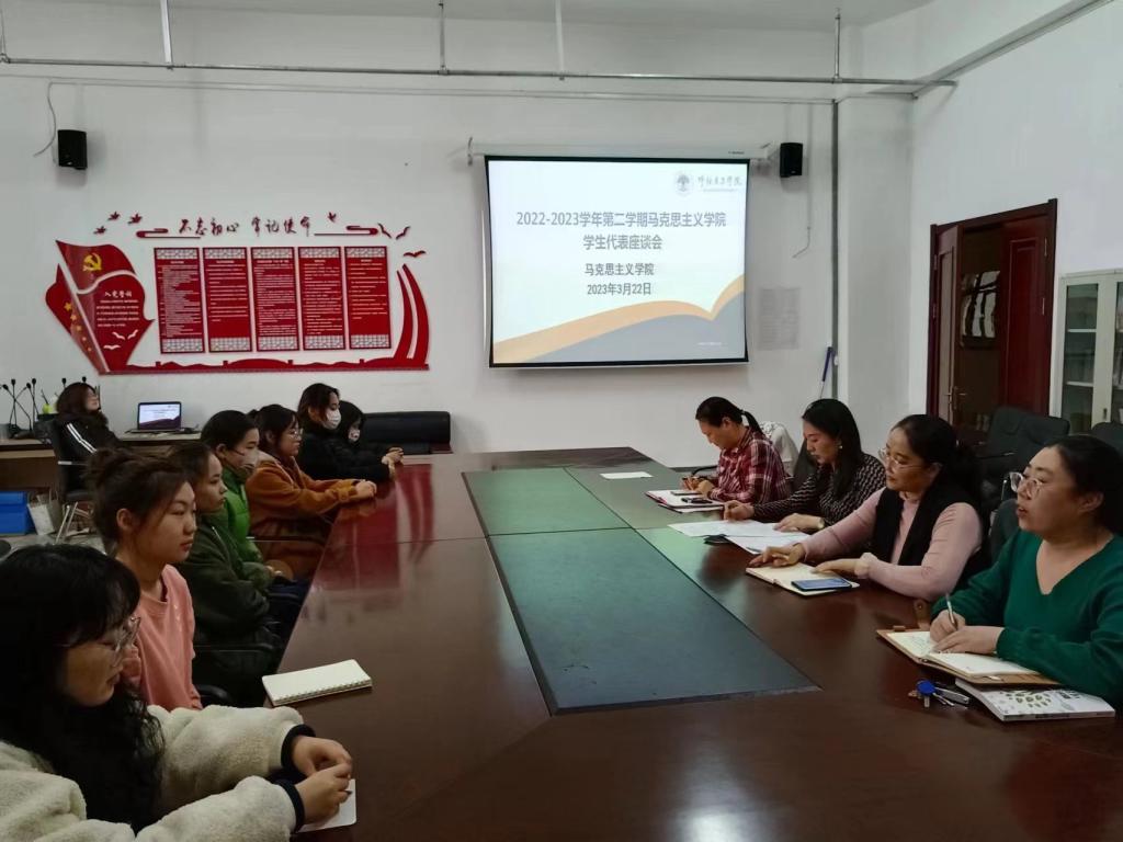 为进一步贯彻“以学生为中心”的育人理念,深入了解学生思想动态和实际需求,积极搭建与学生交流沟通的平台,3月22日下午4:00,成人免费黄色视频于崇文楼B123举办了学生代表座谈会。成人免费黄色视频院长李俏、党总支副书记刘琳,副院长吴秀芳,思想政治教育系主任魏婉莹老师以及各年级班委会成员代表参加。