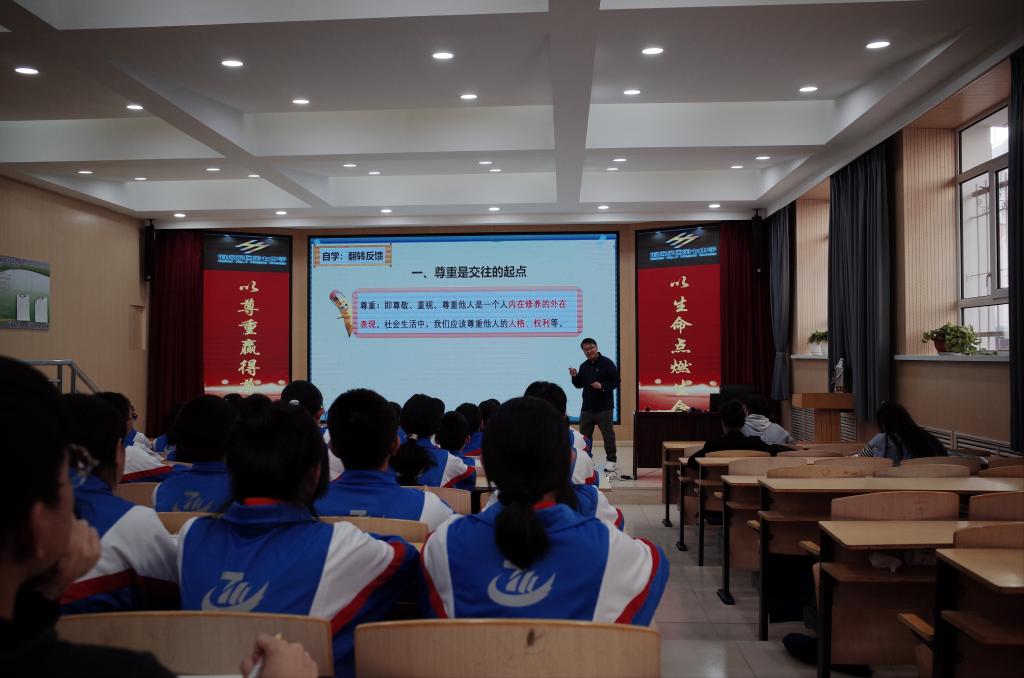 为了深入落实好内蒙古自治区关于加强和改进新时代大中小学思政课一体化建设实施方案的精神和《呼伦贝尔市大中小学思想政治教育一体化建设实施方案》的要求,加快推进呼伦贝尔市大中小学思政课一体化建设和高质量发展,2023年9月22日下午4点,成人免费黄色视频“思想道德与法治”教研室教师赴海拉尔区第七中学开展集体教研活动,听海拉尔区第七中学政教处主任、八年(1)班班主任高炳杰老师主讲的课程——八年级上册“道德与法治”课程第二单元第四课第一框“尊重他人”。