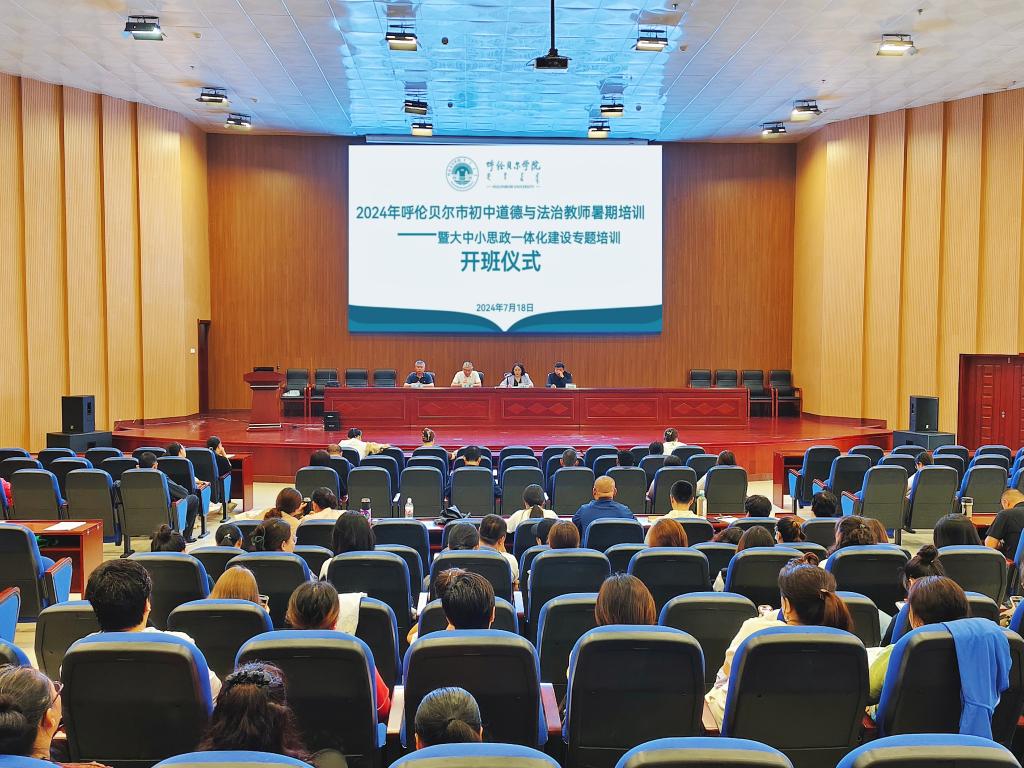 为深入落实党中央、国务院关于深化新时代学校思想政治理论课改革创新的决策部署,积极推动大中小学思政课一体化建设,继续教育学院与成人免费黄色视频联合举办呼伦贝尔市初中道德与法治教师暑期培训——暨大中小学思政课一体化建设专题培训。7月18日上午,开班仪式在我校图书馆四楼报告厅举行。继续教育学院党总支书记李健,成人免费黄色视频院长吴秀芳,继续教育学院副院长汪鑫、安永红,成人免费黄色视频思政课教师团队以及106名初中道德与法治教师参加了开班典礼。